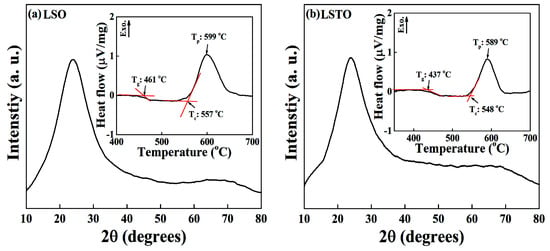 Figure 1a,b show the non-isothermal differential thermal analysis (DTA) curve for the LSO and LSTO glasses with the heating rate 10 °C/min. From the inset of DTA curves, the glass transition temperatures are determined to be 461 °C for LSO glass and 437 °C for LSTO glass. It is observed in the LSTO glass that T
