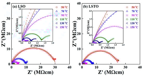 The temperature dependence of the Cole−Cole plots for (a) LSO glass and (b) LSTO glass is shown in