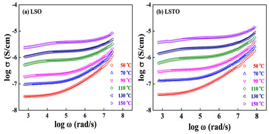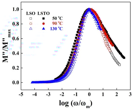 The deviation from the master curve for LSO and LSTO glasses at 50 °C is observed in low and high frequency regions. However, the deviation is immerged into the master curve at 130 °C in a high frequency region, indicating that the cations in LSTO glass are confined to the potential wells as much as those in LSO glass at a high temperature. It is also observed for LSO and LSTO glasses that the full width at half-maximum (FWHM) slightly decreases with the increasing temperature, suggesting that the interaction between conducting ions and surrounding NBOs slightly increases for an increasing temperature.