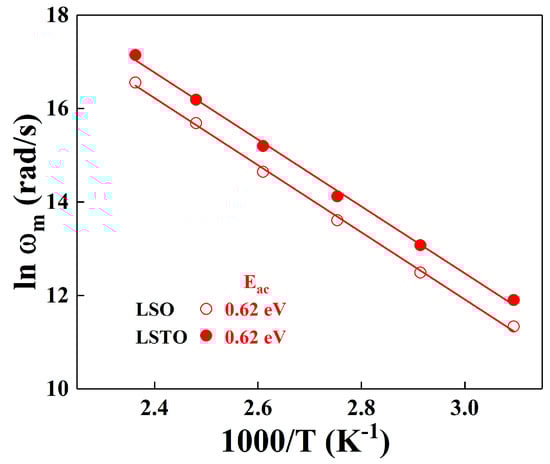 ac, of the LSO glass is the same as the one of the LSTO glass, where the value is 0.62 ± 0.01 eV for LSO and LSTO glasses. The activation energies are almost identical for both representations of the electrical modulus and the power law conductivity.