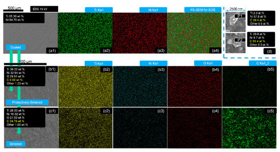 The EDS mapping (Ti, Ni, O, C) and detection of the samples of 500 nm depth: group (a) as-coated, (a1) SEM photograph, (a2) element Ti distribution, (a3) element Ni distribution, (a4) EDS mapping for all elements; group (b) protectively-sintered, (b1) SEM photograph, (b2) element Ti distribution, (b3) element Ni distribution, (b4) element O distribution, (b5) element C distribution; group (c) sintered, (c1) SEM photograph, (c2) element Ti distribution, (c3) element Ni distribution, (c4) element O distribution, (c5) element C distribution; (d) chemical compositions of the typical precipitation EDS with 2 points selected from all the sintered (protective-sintering included) samples.