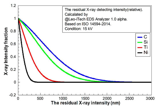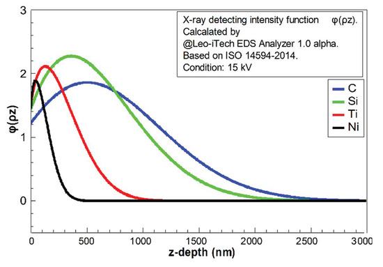 The reflecting X-ray quantity contributed by each “layer” perpendicular to the z-direction can be estimated by the function φ(ρz). In this case, ρ is the density of material and z is the depth. The intensity of the generated X-ray is not monotonically increasing or decreasing with an increment of depth, because the X-ray generating zone was usually a drop-shaped zone under the electron beam bombardment. Therefore, the area of each generating “layer” would be increased firstly and then decreased with increment of depth, affecting the shape of function φ(ρz). The X-ray intensity should be decreasing with increasing depth by absorption [26]. According to ISO 14594-2014, φ(ρz) could be calculated. The studied pure elements in this case (C, Si, Ti, and Ni) were calculated and are shown in Figure 4 and Figure 5; these results were found using the Leo-iTech EDS Analyzer 1.0 alpha.
