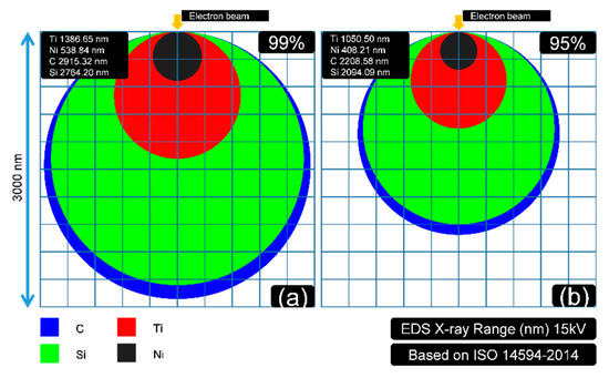 The illustration (X-ray zone was regarded approximately as a sphere) of the detected X-ray depth for each element (C, Si, Ti, and Ni): (a) depth of 99% of the X-ray signal detected; (b) depth of 95% of the X-ray signal detected.