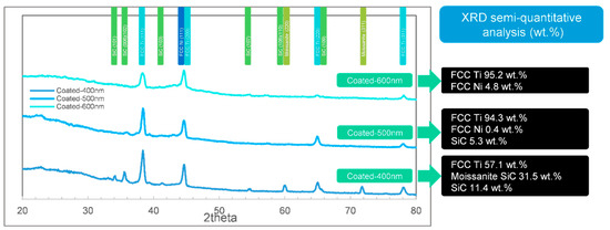 It was also found that the SiC phases (including moissanite SiC) could be detected in 400–500 nm groups of the as-coated samples. 42.9 wt.% SiC (including moissanite SiC) was found in the 400 nm group and 5.3 wt.% in the 500 nm group, by FWHM. However, the 600 nm group detected few SiC. It showed that the detected SiC sharply decreased while the coating depth increased, nonlinearly. Therefore, the possible explanation is that the as-coated films < 500 nm depth were not compact, just as shown in Figure 1a2. This result indicates that the coating of Ni–Ti should be deposited at least 600 nm to be qualified.