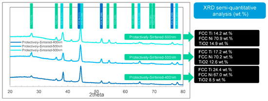 To analyze the structures of the films in detail, the XRD results are essential. The XRD tests (including semi-quantitative analysis of phases) of the 3 different samples (coated, sintered, and protectively-sintered) with depths ranging from 400 to 600 nm are illustrated in Figure 7, Figure 8 and Figure 9.