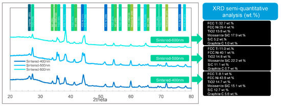 For the normally-sintered sample in Figure 9, the phase composition was complex. The SiC phases (including moissanite SiC) were found in all the coatings ranging from 400 to 600 nm. Compared with the XRD result in Figure 7 (SiC only appeared in the 400 and 500 nm groups) and typical morphology in Figure 1c1, one might conclude that the unprotected samples were oxidized with the mentioned porous structures (in Section 3.1 and Section 3.2), which could not prevent the X-ray touching the substrates (SiC). Since this term existed, the trend of the phase changes was not clear in this situation. Nevertheless, the XRD results were also useful to estimate the degree of pollution. The carbon fractions in Figure 9, by XRD, were lower and more reasonable than the EDS result in Table 1 because the detected EDS fraction of carbon was excessive according to Figure 4, Figure 5 and Figure 6.