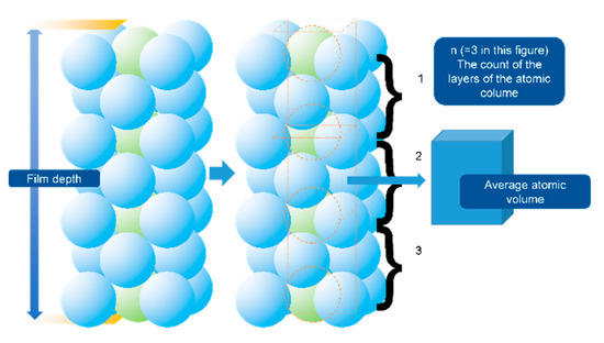 In Equation (4), t is the depth of the film, n is the total crystal plane (being parallel to the film surface) number in the selected atomic column, and Ω is the average atomic volume (regarded similar for the HCP and FCC states). The constant 1.12 × 10−20 is the recommended difference in bulk free energy (FCC-HCP) J/atom.