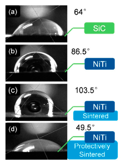 Figure 11 shows that the contact angle between the distilled water and the naked SiC substrate is 64°. When coated with Ni–Ti, the contact angle increased to 86.5°. This increment meant that the tested Ni–Ti surface energy was reduced. Furthermore, the situation became worse after sintering without protective improvements.
