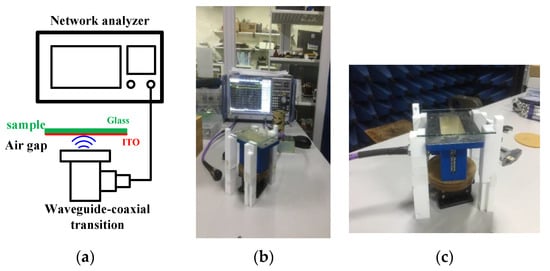 A schematic view and photo of the measurement system used in this work are shown in Figure 1. A standard coaxial to waveguide transition (XB-WA284, Xibao Electronic Technology Co. Ltd., Beijing, China) was used as a transceiver. The waveguide was a standard WR284 waveguide with a standard flange. Microwave power was fed into the waveguide through the N type coaxial connector and it radiated onto the material under test. Depending on the sheet resistance of the nanomaterial, part of the microwave power will be reflected, as it was here. A network analyzer (ZND, Rohde & Schwarz GmbH & Co. KG, Munich, Germany) was used to measure the normalized reflection coefficient, namely S11 when transparent conductive glass was placed on the waveguide flange. Before sample measurement, the network analyzer was calibrated using a one-port reflected OSM routine to make the reference plane align with the coaxial connector of transition. Other parameters for VNA setup were: start frequency , stop frequency ; the input power was set to ; the IF bandwidth for all the measurements was adjusted to ; the averaging factor was 10. To restore the integrity of the signals reflected by the waveguide, the “Reduce Noise” option of the VNA was utilized.