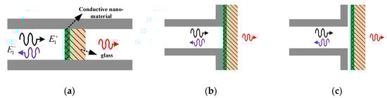 Here, is the width of the waveguide, is the angular frequency, and are the vacuum permeability and permittivity, respectively, is the conductivity of the conductive nanofilm and and are the relative dielectric constant and the loss tangent of the substrate, respectively. If the substrate can be neglected, then Equation (1) can be simplified to
