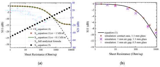 (a) Analytical calculations for ideal case; (b) simulations for nonideal cases. Default conductivity for nanofilm is 1 MS/m, glass thickness is 1.1 mm, and working frequency is 2.5 GHz. The curve, denoted as “S11, full analytical formula”, can be obtained using Equation (12) from [17].