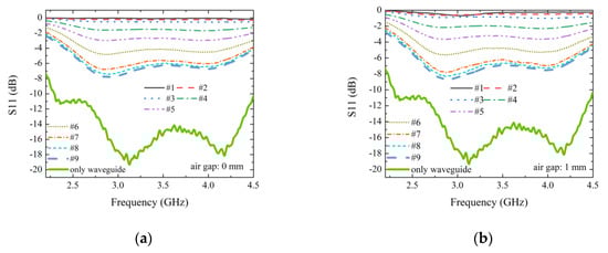 Measured normalized reflection coefficient (S11) for all of the samples with glass thickness 1.1 mm: (a) without air gap; (b) with 1 mm air gap.