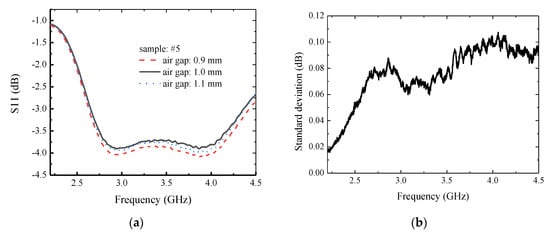 Measured effect of air gap: (a) S11 vs. frequency; (b) standard deviation of S11.