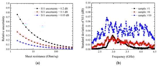 Using Equation (6), we analyzed the effect of measurement uncertainty of S11 on the sheet resistance prediction accuracy as shown in Figure 7a. It can be seen that: 1. measurement accuracy increased with decreasing S11 uncertainty; 2. measurement accuracy was better for higher resistance samples. These observations are helpful for understanding the measurement results of samples with sheet resistance below ~10 Ohm/sq. In Figure 7b, we present the measured effect of the horizontal place position of the sample on S11. We moved the sample along the x- and y-axes with 1 mm steps and 3 mm total displacement. With these nine measurements, we calculated the standard deviation. It can be seen that the change of S11 was below 0.1 dB. Thus, the result indicates that the proposed method is, to some degree, insensitive to placement locations. This shall be helpful for real application. It should be noted that the proposed method has a minimum requirement on sample size; this will be studied in near future. To summarize, the above uncertainty analysis may indicate that the major contribution of sheet resistance estimation error is coming from S11 measurement.