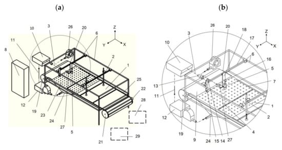 Diagram of the stand for cutting labels from a multilayer polypropylene film during production of in-mold labelling (IML) (a) and a view of a movable system based on a plotter for ultraviolet (UV) laser cutting (b): 1—label, 2—manipulator, 3—UV laser beam, 4—UV laser spot, 5—UV laser cutting head, 6—flatbed plotter, 7—label contour, 8—control cabinet, 9—foil, 10—laser source, 11—coolant, 12—cooler, 13—expander, 14—mirror I, 15—mirror II, 16—mirror III, 17—crossbeam, 18—handle, 19—foil unwinding roller, 20—unwinding roller drive, 21—openwork roll, 22—openwork roll drive synchronized with the drive of the unwinding roller, 23—perforated table, 24—vacuum chamber, 25—openwork, 26—dry air compressor, 27—nozzle for drying and cleaning the head, 28—robot feeding the film to the injection molding machine, 29—injection molding machine.