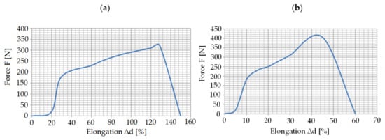 Graph of changes in tensile force as a function of elongation for a foil sample with a thickness of: (a) t = 80 µm, (b) t = 60 µm.