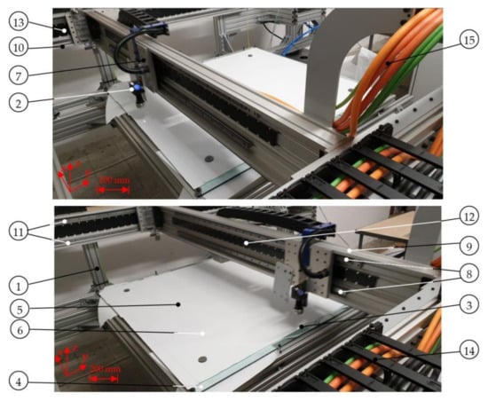 Test stand for cutting polypropylene foil using the phenomenon of cold ablation in various stages of operation: 1—frame made of aluminum profiles, 2—movable UV cutting head, 3—UV laser spot, 4—fixed table for laying polypropylene foil, unwound from a roll, 5—cut foil with dimensions 1040 mm × 1040 mm, 6—weights for pressing the foil against the table, 7—post for attaching the UV cutting head, moving along the X axis, 8—guide posts (7), 9—movable crossbar, 10—stationary upper right longitudinal member along the Y axis, 11—guides of the stationary upper right longitudinal member (10), 12—linear motor guide for driving along the X axis, 13—linear motor guide for driving along the Y axis, 14—chain guide for cables, 15—wires [].