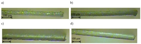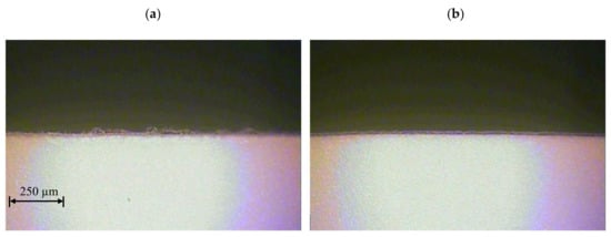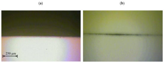 Exemplary photos of the cutting surface of the foil with a thickness of t = 70 µm are shown in Figure 7. A complete separation of the material was obtained for all analyzed cases. For the cutting speed of v = 0.222 m/s, there are visible defects of the cut surface in the form of slivers, fines and debris (Figure 7a). Exemplary photos of the cutting surface of the foil with a thickness of t = 80 µm are shown in Figure 8. Complete separation was not obtained for cases of cutting at v = 0.751 m/s and UV laser frequency f = 20 kHz and f = 150 kHz. In other cases no defects of the cut edge were observed.