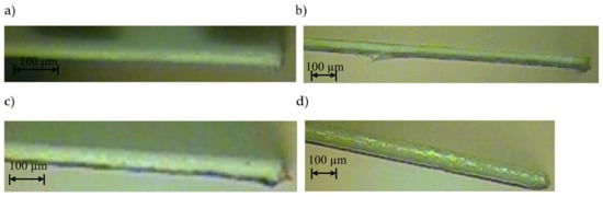 View of cut surface of foil thicknesses: (a) t = 50 µm, (b) t = 60 µm, (c) t = 70 µm, (d) t = 80 µm.