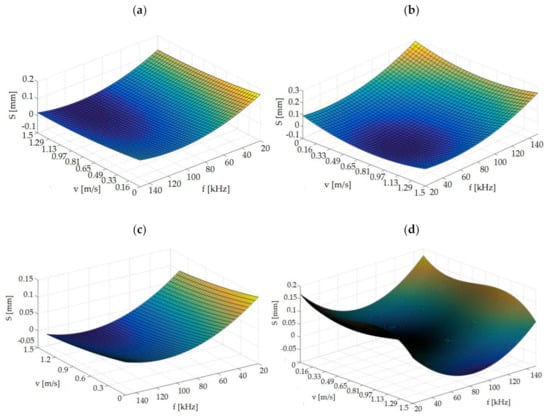 Graph of dependence S = f(v, f) for: (a) t = 50 µm, (b) t = 60 µm, (c) t = 70 µm, (d) t = 80 µm.