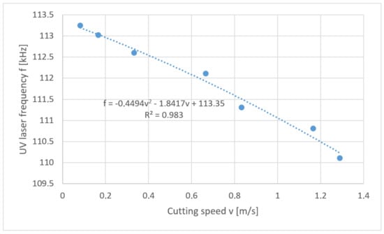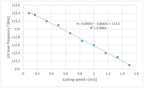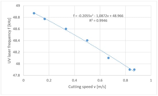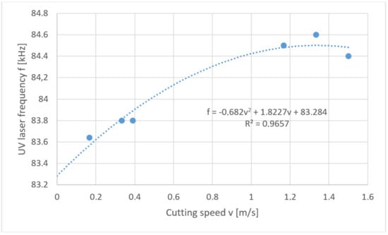 Based on the analysis of the process, a set of factors significantly affecting the results factors was determined. Then, the ranges of variability of the examined (control) factors were determined. The tested factors include cutting speed in the range: v = x1 = 0.003–1.5 m/s and UV laser frequency in the range: f = x2 = 20–150 kHz. Tests are carried out according to the five-level uniform rotatable test plan (Table 3) [], while statistical calculations were performed in accordance with the methodology described in [,].