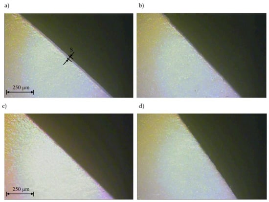 In the last stage of the research we performed the UV laser cutting process of polypropylene foil using a cutting speed of v = 1.5 m/s. The research was undertaken for optimal frequencies f selected for each PP foil thickness individually, i.e., for t = 50 µm, f = 110 kHz, for t = 60 µm, f = 47.9 kHz, for t = 70 µm, f = 112.2 [kHz], and for t = 80 µm, f = 84.5 kHz. Such a large frequency variation results from the properties of the material being cut and the characteristics of the laser source. The aim was to achieve maximum process efficiency. For the proper control of the laser, we used the function developed after solving the inverse task function f = f (v). The appearance of the intersection of samples is shown in Figure 18. The quality of the cut edge is very high and free from defects. The value of the S zone did not exceed the allowable S = 0.17 mm.
