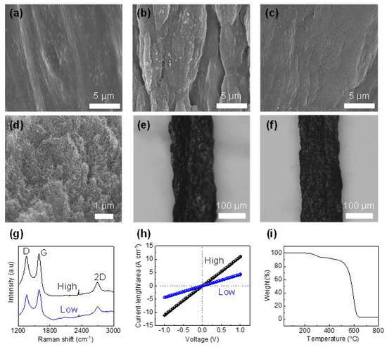 To investigate the impact of the current level on the phase and crystallinity, Raman spectroscopy measurements were performed. As shown in Figure 1g, both nanosoldered samples exhibit three major peaks at 1355, 1592, and 2697 cm−1, corresponding to the D mode (sp3-based defects), G mode (sp2-hybridized graphitic), and 2D mode (second-order D mode) of typical carbonaceous materials [36]. Two samples show the difference in the full width at half maximum (FWHM) of the peaks. For example, the FWHM of the G peak becomes narrower as the nanosoldering current increases: 65 cm−1 for the low-current fiber and 61 cm−1 for the high current fiber. This indicates that a higher current produces less disordered carbon [37]. A similar trend is also observed in conventional carbonization; graphitic carbons gradually evolve with increasing temperature [37]. Figure 1h shows that the electrical conductivity of the high-current sample (10.9 S cm−1) is enhanced by a factor of 2.5 relative to the low-current sample (4.3 S cm−1). This may be because electrical connectivity among the CNTs of the high-current sample is highly enhanced compared to the low current sample, as confirmed in the morphologies above (Figure 1b,c). Since the aC-CNTs fiber is composed of amorphous carbon and carbon nanotubes after Joule heating, it shows a typical TGA curve of carbonaceous materials in air (Figure 1i). The weight drops suddenly, starting from ~550 °C, and becomes nearly zero at ~600 °C, indicating full combustion.