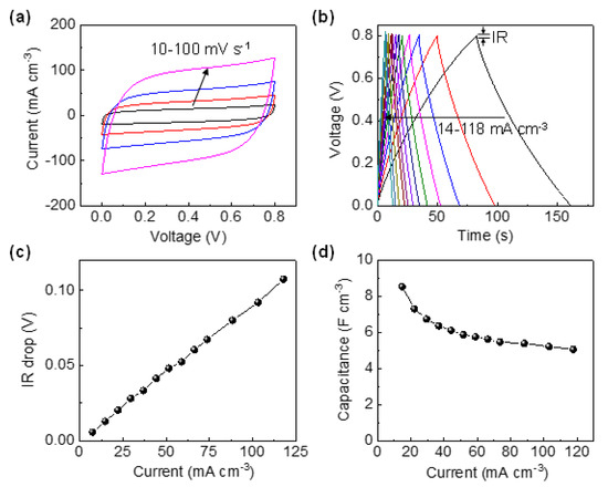 Since the difference in the electrical conductivity between two nanosoldered samples is modest, the electrochemical performances of the high-current sample only (aC-CNTs hereafter) were examined. The fSCs were assembled in a configuration of two parallel fibers separated by the PVA/H3PO4 solid electrolyte on a flexible PET substrate. The electrochemical properties of the fSCs were evaluated by two-electrode cyclic voltammetry (CV) and galvanostatic charge and discharge (GCD) measurements over the voltage window of 0 to 0.8 V. Figure 2a presents the CV curves at different scan rates ranging from 10 to 100 mV s−1. At all scan rates, the CV curves exhibit a nearly rectangular shape, indicating that an electrical double layer effectively forms at the electrode/electrolyte interface and charge propagates smoothly across the electrodes [9,17]. The rate-dependent electrochemical properties of the fSCs were examined by conducting GCD measurements at different current densities ranging from 14 to 118 mA cm−3 (Figure 2b). The GCD voltage profiles commonly exhibit a symmetrical triangular shape during charge–discharge processes, a typical behavior of an ideal supercapacitor [38]. This agrees with the CV results. The IR drop, the voltage difference between the initial two points of a galvanostatic discharge curve, was plotted against the current density, as shown in Figure 2c.