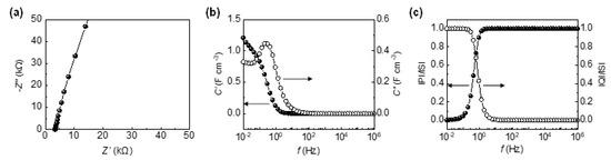 To examine the energy storage and dissipation characteristics, a complex power analysis was performed using the complex capacitance [35]. The complex power, S(ω), has a form of: