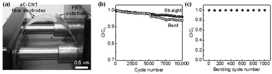 For potential applications in curved surfaces or in complex geometry, the aC-CNTs fSCs need to demonstrate the high and stable storage performances when deformed. As shown in Figure 4a, the fSCs integrated on the PET substrate were bent with a radius of curvature of ~12 mm (90° bend), which is determined to be the minimum value for stable charge and discharge, and their galvanostatic cycling stability was evaluated. Figure 4b demonstrates that, in their bent state, the electrodes retain 94% of the initial capacitance for at least 10,000 charge/discharge cycles at a constant current of 14 mA cm−3, which is nearly identical to the straight (undeformed) sample after the same cycles (96% capacitance retention). This indicates that the aC-CNTs fiber electrodes still preserve good electronic and ionic pathways even when deformed. Furthermore, the SCs preserve nearly 100% of the initial capacitance after 1000 cycles of bending-straightening test, with a radius of bending curvature of ~12 mm (Figure 4c). The overall results imply that the aC-CNTs fiber electrodes barely suffer from any significant mechanical damage and electrical disconnection when subjected to mechanical stress.