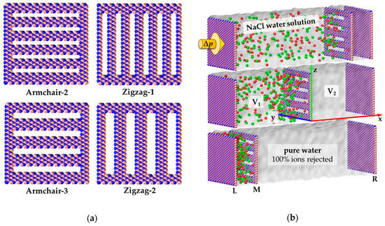 Models of nanoporous membranes and the simulation setup: (a) Armchair and zigzag design of nanopores in h-BN nanosheet; (b) Simulation domain comprises two volumes—the feeder filled with NaCl water solution (left) and the outlet reservoir (right). The model contains three h-BN nanosheets L, M, and R. The middle one (M) is a nanoporous membrane, and its coordinates are fixed. Plane of M nanosheet has a position x = 0, axis x is oriented in the direction of the filtration. Axes y and z are oriented parallel to the armchair and zigzag edges of h-BN, respectively. Extra pressure Δp is applied to nanosheet L (yellow arrow). Atom colors: boron—pink, nitrogen—blue, sodium—red, chlorine—green, water oxygen, and hydrogen atoms are not shown for clarity.