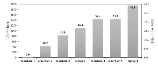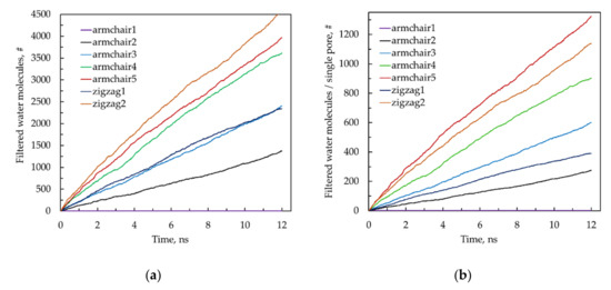 It can be seen from the obtained curves (Figure 2a,b) that during at least the first 12 ns of filtration, the time dependence of the number of filtered water molecules is approximately linear for all considered cases. Using the least-squares method, we determined the productivity of the model membranes in conventional units L/(cm2·day·MPa), as well as in L/(m2·h·bar). The predicted productivity of the considered membranes ranges from 10.2 L/(cm2·day·MPa) (for Armchair-2) to 46.8 L/(cm2·day·MPa) (for Zigzag-2). These values are comparable with the predicted productivity of the most productive promising nanotechnological membranes [13,15,16,20] and ~2 orders of magnitude higher than the productivity of modern commercial facilities [14]. The estimated performance for each of the considered model membranes in order of increasing productivity is shown in the diagram in Figure 3.