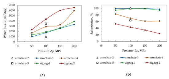 Divalent cations are responsible for incrustation or deposits on water treatment equipment, which is one of the problems accompanying water processes and recycling [50,51]. Therefore, we carried out additional studies of Ca2+ and Mg2+ ions rejection at pressure drop Δp = 100 MPa. Taking into account the above results for salt (Figure 4b), we limited ourselves to the study of membranes Armchair-3 and Zigzag-1. The diagram in Figure 5a shows that both membranes completely reject divalent cations. This also means that at a lower operating pressure, the result will be the same. Note that 100% rejection of Ca2+ and Mg2+ at typical operating pressures can be expected from Armchair-2 membrane, which has a smaller effective slit width.