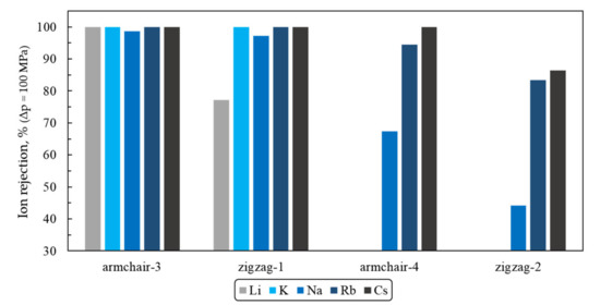 Estimates of cation rejection (pressure drop Δp = 100 MPa). The determination of Li+ and K+ ions rejection was not carried out for Armchair-4 and Zigzag-2 membranes.