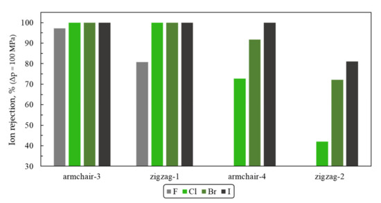 Halide-ions rejection at pressure drop Δp = 100 MPa (a rejection rate of Armchair-4 and Zigzag-2 membranes for fluorine anions F– was not assessed).