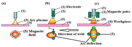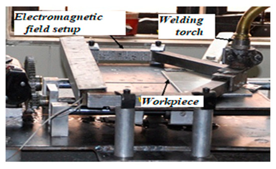 Its application in the field of welding around the weld zone was initiated in circa 1962. The study estimated the effect of a magnetic field on the molten metal pool. Since 2000, a magnetically controlled welding method has widely been used in inert gas welding {tungsten inert gas (TIG)/metal inert gas(MIG)/metal active gas(MAG)}, resistance welding, submerged arc welding, laser beam welding, and hybrid welding. Therefore, this type of controlled arc welding is a favorable welding process. Bachmann et al. [6] found that the EMF controls the flow of the metal, the weld pool temperature distribution, and the shape of the weld cross-section. The supplementary electromagnetic force alters the flow conditions of the molten metal. The optimized magnetic field intensity can effectively diminish the charged particle density by altering moving charged particles under the Lorentz force. Nomura et al. [7] investigated permanent magnets’ effect on the plasma arc shape of TIG welding arc and observed a controlled weld arc and subsequently achieved a sound weld shape.