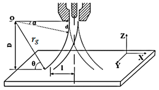 Furthermore, the radius of gyration (rg) directly affects the length (l) of the arc on the workpiece, as shown in Equation (10). The relation is obtained using a simple geometrical calculation with reference to Figure 3 and using Equations (7)–(9). To get the relation between the arc radius (rg), the arc length on the workpiece (l), and the distance between the top of the workpiece and the bottom of the torch (D), from the geometry shown in the figure, for any angle θ using Pythagoras’s theorem: