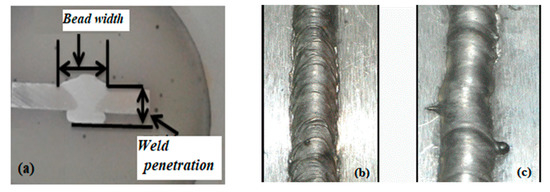 Figure 5b,c shows a typical weld bead contour, showing the magnetic field’s influence on the bead’s surface. The bead’s surface provides a vital sign of the process’s steadiness and can be seen by bare eyes. A smooth surface denotes a steady process, while an uneven and irregular surface indicates a flawed process.