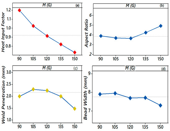 The functional behavior of the EMF on HIf, AR, P, and W is shown in Figure 6a–d. The HIf decreased as the magnetic field (M) increased. It decreased steadily for all values of the magnetic field (M) from 1.2 to 0.7. The higher values of M negatively affected the bead characteristics, as initially, the penetration depth (P) was low, increases till 120 G for M, and then again, P started reducing. The variation in AR (3.9 to 3.5) was not significant until M reached 120 G, because in this range, P increased while the change in the bead width (W) was insignificant or decreased.