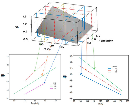The three-dimensional (3D) and two dimensional (2D) plots show the dimensional relationship between the responses and variables. These plots are also known as interaction effect plots. Here, the 2D plot shows the behavior of a 3D plot through the cut section to get a deep insight into the relationship between the magnetic field (M) and wire feed rate (F) for the corresponding responses of the heat input factor (HIf), aspect ratio (AR), weld penetration (P), and bead width (W).