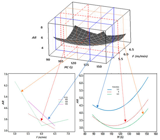Furthermore, Figure 10 shows the critical 3D and 2D relationships between the aspect ratio (AR), magnetic field (M), and wire feed rate (F). It was observed that as M increased from 90 to 110 G, AR decreased for all values of F. The slope of AR was negative until M was 110 G. However, beyond 110 G for M, AR started increasing, and the slope was positive and steeper. For a good quality weld, a low value of AR is considered a desirable quality. Thus, this undesirable rise in AR may hamper the quality of the weld, and it was because of the effect of the higher magnetic field (M) on the arc density and the effect of the wire feed rate (F) on HIf. It also resulted in significant changes in the bead geometry. At an F of 5.5 m/min, AR was about 4.5 at an M of 90 G, but as F increased, AR decreased to 3.0 at an M of 120 G. Thus, experimentally, it was observed that higher F values till 120 G for M were desirable for the good quality weld. However, beyond 120 G, the objective function used to minimize the AR was hampered.