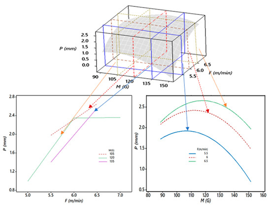 Furthermore, Figure 11 shows the critical 3D and 2D relationships between the weld penetration (P), magnetic field (M), and wire feed rate (F). It was observed in Figure 10 that as the magnetic field (M) increased from 90 to 120 G, the weld penetration (P) increased significantly for all values of the wire feed rate (F). The further rise in M resulted in a decreasing trend of the P curve. It was at a maximum when F was a maximum and M was in the range of 110–120 G, where the minimum occurred when M was at a maximum and F was at a minimum. The changes in F relative to M from 5.5 to 6.5 m/min significantly changed P.