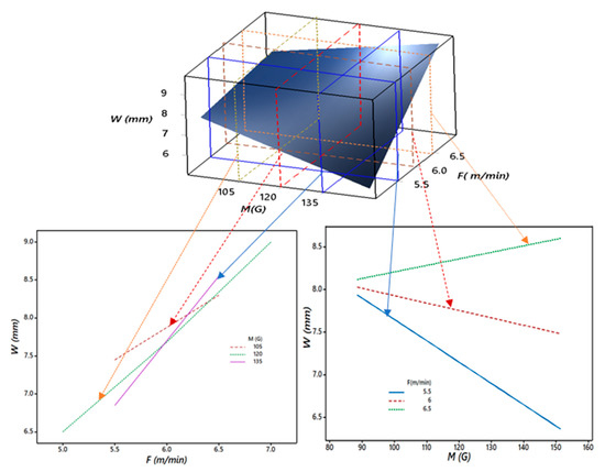 Furthermore, Figure 12 shows the critical 3D and 2D relationships between the bead width (W), magnetic field (M), and wire feed rate (F). It is observed from Figure 11 that the bead width (W) increased for all values of M from 90 to 150 G for F as 6.5 m/min or above. This may have been due to the dominating effect of HIf for higher wire feed rate (F), along with the magnetic field (M). The slope of the bead width (W) significantly decreased at a 5.5 m/min wire feed rate (F) for all values of the magnetic field (M). The trend of the plot confirmed the previously discussed behavior of AR for the interaction of M and F. Thus, it was also observed that the direct effect of the wire feed rate (F) was the most vital. Still, at the same time, the magnetic field’s (M) direct effect and its interaction along with wire feed rate (F) could not be ignored.