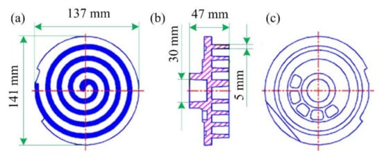 Structure and dimensions of the scroll for scroll compressors applied in automotive air conditioning: (a) front view, (b) sectional view, and (c) back view.