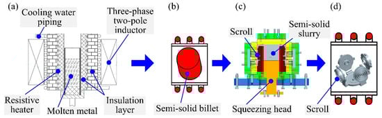 Electromagnetic stirring (EMS)-based semisolid multicavity (SMSC) process of one mold for four aluminum alloy scrolls: (a) Stage—EMS preparation, (b) Stage II—remelting, (c) Stage III—forming process, and (d) Stage IV—T6 heat treatment.