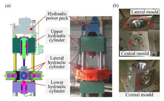(a) The multicavity squeeze casting hydraulic press and (b) the multidirection squeeze forming mold for manufacturing scrolls.