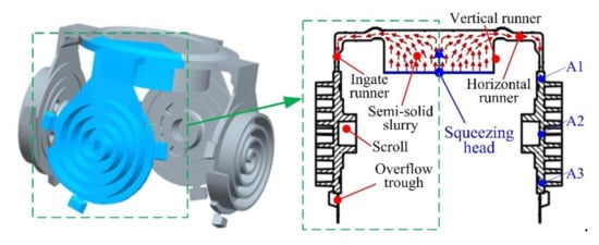 A schematic diagram of the whole semisolid multicavity squeeze process for fabricating four scrolls under one mold is illustrated in Figure 4. Under the action of the squeeze head, the semisolid slurry flows from the vertical and horizontal runner to the ingate runner and fills the mold cavity. The gas and redundant semisolid slurry flow out from the overflow trough. The scrolls can then be fabricated after the solidification of semisolid slurry. Through this designed mold, symmetry in the filling flow of the semisolid materials for the four scrolls can be achieved in the squeeze process.