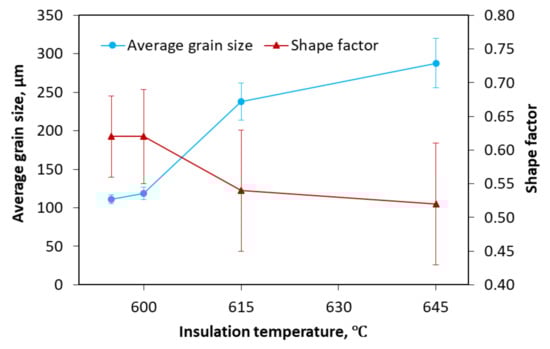 - Reducing the insulation temperature to the semisolid range can decrease the grain size, increase the shape factor, and improve the mechanical properties. The minimum grain size was found as 111 ± 3 μm at the insulation temperature of 595 °C.