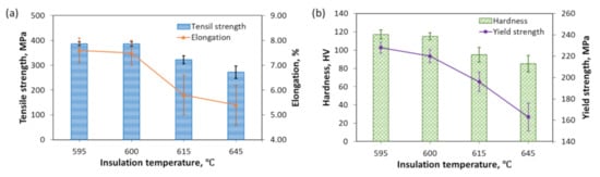 The mechanical properties investigated in this study are tensile strength, yield strength, elongation, and hardness. The mechanical properties of the scroll after the T6 heat treatment at different insulation temperatures in Stage II are presented in Figure 7. It was found that the tensile strength, yield strength, elongation, and hardness increased and almost stabilized when the insulation temperature dropped from the liquid state to the semisolid temperature range. The tensile strength increased from 272 ± 25 to 385 ± 9 MPa when the insulation temperature decreased from 645 to 600 °C, which further rose to 386 ± 8 MPa at the insulation temperature of 595 °C. The elongation of the scroll was measured as 5.4 ± 1.2% at the insulation temperature of 645 °C, which significantly increased to 7.5 ± 0.5% and 7.6 ± 0.5% at the insulation temperatures of 600 and 595 °C, respectively. An increase in the yield strength was observed from 163 ± 13 MPa at the insulation temperatures of 645 °C to 228 ± 5 MPa and 595 °C. The hardness of the scroll was observed as 85 ± 9 and 95 ± 8 HV at the insulation temperatures of 645 and 615 °C, respectively, which dramatically increased up to 117 ± 5 HV at the insulation temperature of 595 °C. This improvement in the mechanical property of the scroll was because the primary crystal grains with uniform size and round shape can be obtained at the semisolid temperature. These improved crystal grains can effectively reduce the microscopic stress concentration generated by the coarse dendrites formed at the liquid-state temperature and slow down the formation and expansion of voids. Moreover, when the insulation temperature was relatively high at the liquidus or near-liquidus temperatures, the turbulent jetting of the slurry would take place during the filling process due to the low viscosity, which would cause the internal defects inside the scroll and the consequently low mechanical properties. The improvement in the yield strength with the decrease in the insulation temperature was because of the reduced grain size, which can be expressed by the classical Hall–Petch relationship, as shown in Equation (3) [33,34]