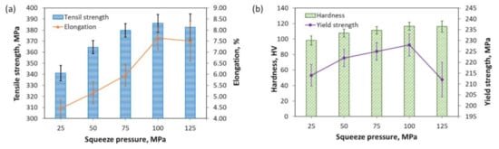 - Increasing the squeeze pressure is beneficial to reduce the microscopic pores of the microstructure, increase the compactness of the crystal grains, and improve the mechanical properties. However, the improvement in the mechanical properties is not obvious when the squeeze pressure exceeds 100 MPa. The maximum tensile strength, yield strength, and hardness were observed as 386 ± 8 MPa, 228 ± 5 MPa, and 117 ± 5 HV, respectively, at the squeeze pressure of 100 MPa.